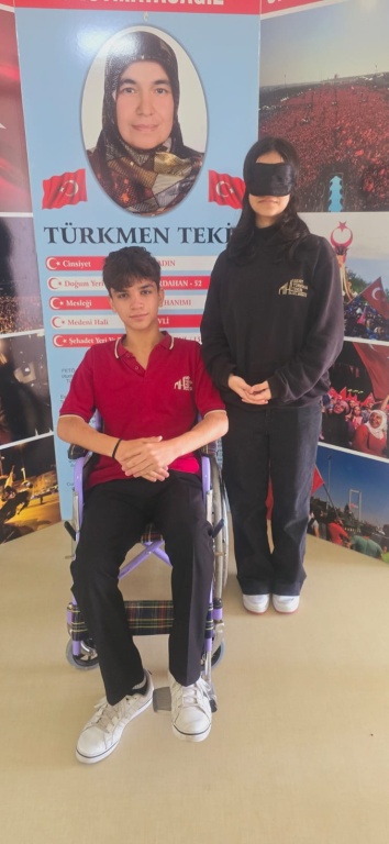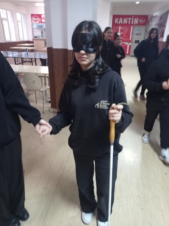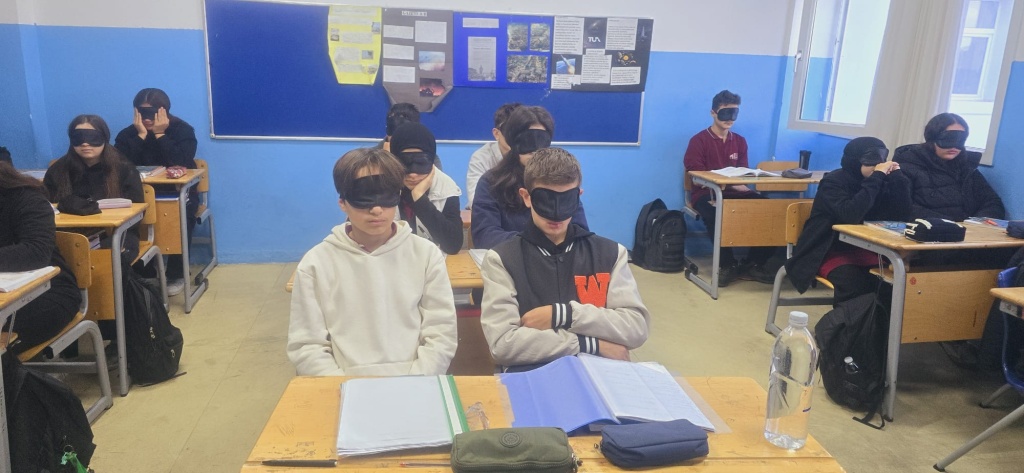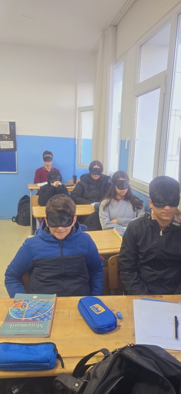 Ayrıca matematik dersinde öğrencilerimiz siyah göz bandı takarak dersi dinledi ve görme engelli bir bireyin günlük hayatta karşılaşabileceği zorlukları deneyimledi.
