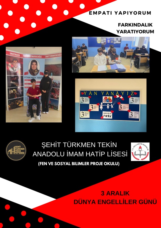 Şehit Türkmen Tekin Anadolu İmam Hatip Lisesi, 3 Aralık Dünya Engelliler Günü kapsamında anlamlı bir farkındalık etkinliğine ev sahipliği yaptı. "Benimle Şükreder Misiniz?" projesi çerçevesinde düzenlenen "Empati Yapıyorum, Farkındalık Yaratıyorum" etkinliği, okulun konferans salonunda gerçekleştirildi.