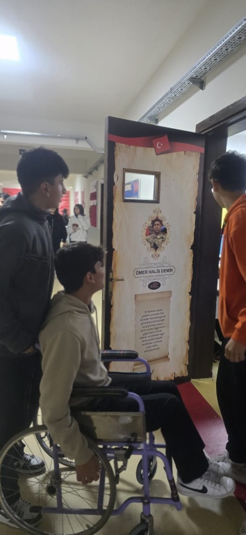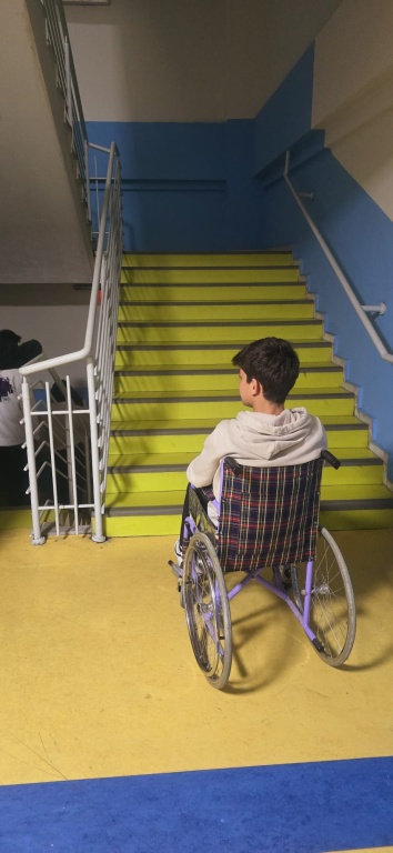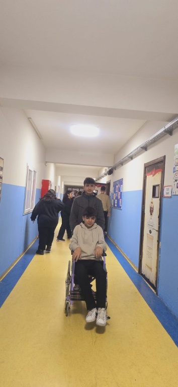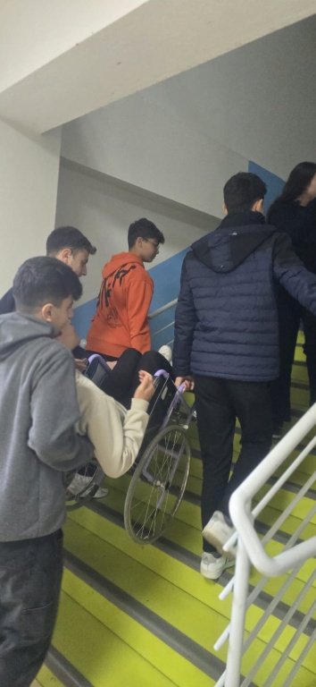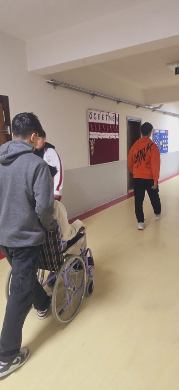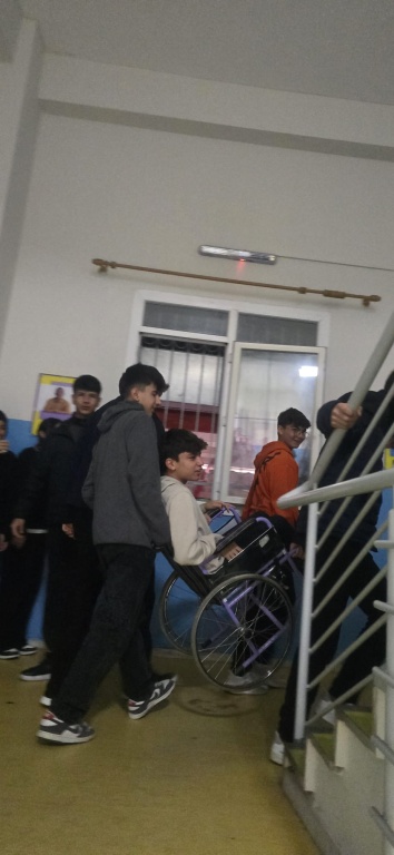 Öğrencimiz Cemal ise tekerlekli sandalye ile gün boyu derslere katıldı. Cemal, "Yürüyememenin ne kadar zor olduğunu, özellikle merdivenlerden inip çıkarken büyük sıkıntılar yaşandığını anladım. Ancak arkadaşlarım bana destek oldular, bu da bana dayanışmanın ne kadar önemli olduğunu gösterdi. Hepimiz birer engelli adayıyız. Engelli bireylere karşı saygılı olup onları anlamalı ve onlara yardım etmeliyiz," diyerek düşüncelerini paylaştı.